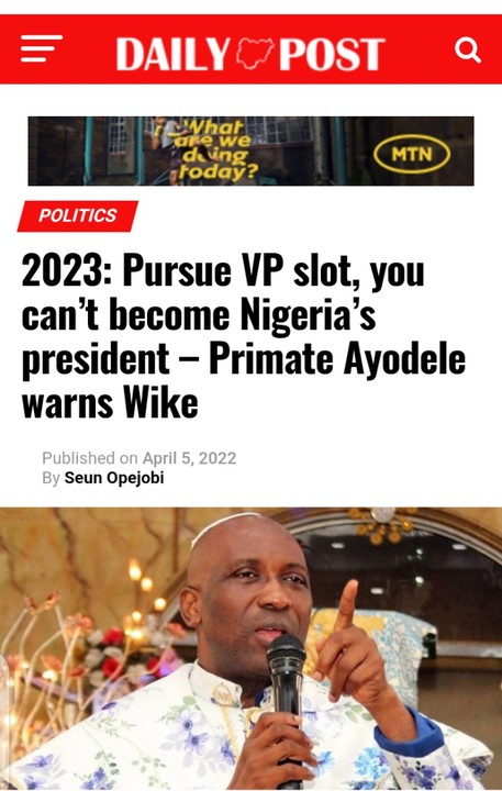 The Leader of INRI Evangelical Spiritual Church, Primate Elijah Ayodele, on Tuesday, warned Governor Nyesom Wike of Rivers State over his presidential ambition.