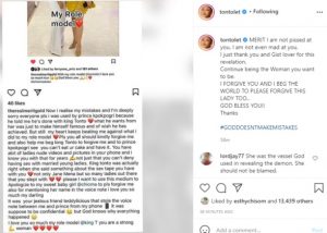 Reacting to the apology note, Tonto Dikeh appreciated Merit Gold for the courage to come out clean amid their relationship crisis.