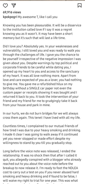 Long before the voice note was released, I ended the relationship. It was no shock then that after I called it quit, you allegedly conspired with a blogger who already reached out to you about the voice note before the breakup to now release it. I’m ready to foot the NDLEA cost to carry out a test on you if you never abused hard smoking and heavy drinking and if found to be false, I will waive my right to trial for one year. This was what broke us up and not an aftermath voice note.