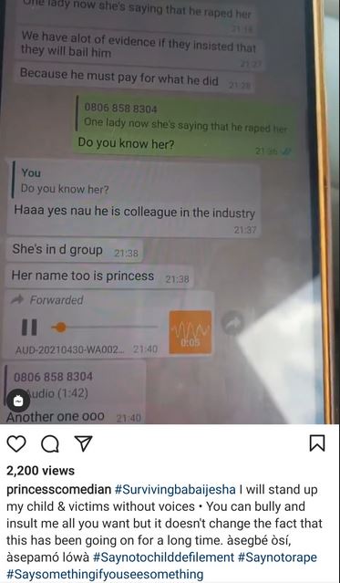 Nigerian comedienne, Princess who accused Yoruba actor, Baba Ijesha, of allegedly defiling her foster daughter has released damning allegations about the embattled actor on Instagram.