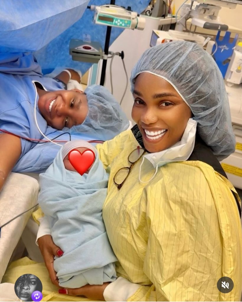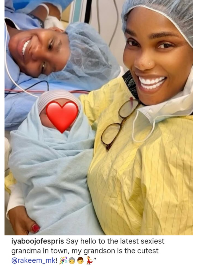 Actress Iyabo Ojo announced the joyful news with a photo of her standing beside her daughter, Priscilla Ojo, in the hospital labour room while carrying her newborn grandson.