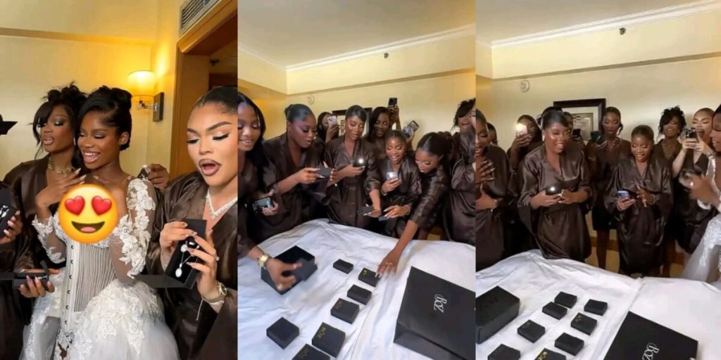 Photos of Priscilla Ojo gifting her bridesmaids jewelry surface online, capturing their heartwarming reactions as her white wedding is underway.