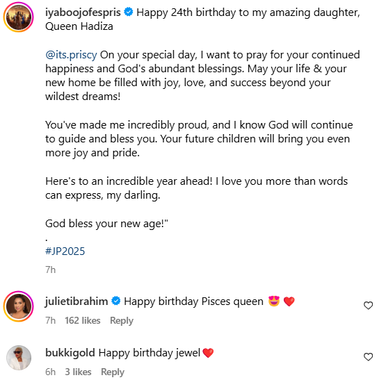 “Happy 24th birthday to my amazing daughter, Queen Hadiza. On your special day, I pray for your continued happiness and God’s abundant blessings. May your life and your new home be filled with joy, love, and success beyond your wildest dreams!” she wrote.