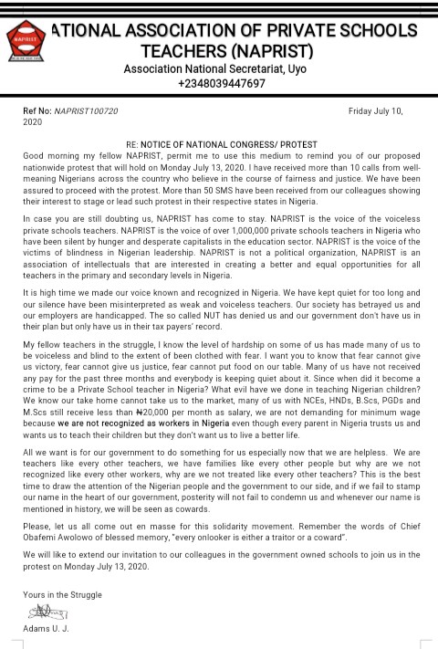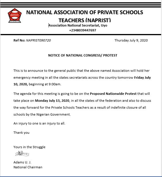Following the notice of the proposed nationwide protest by the National Association of Private Schools Teacher issued on Thursday July 9, 2020, the self acclaimed association national chairman has called on all the private schools teachers to come out en masse in all the states of the federation for the protest.