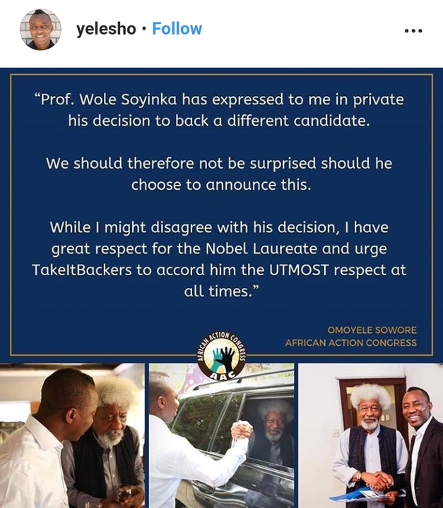Sowore wrote on Instagram, “Prof. Wole Soyinka has expressed to me in private his decision to back a different candidate.