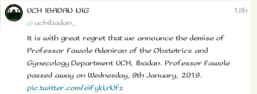Report reaching NairaFame, It is with great regret that we announce the demise of Professor Fawole Adeniran of the Obstetrics and Gynecology Department UCH, Ibadan. Professor Fawolepassed away on Wednesday, 9th January, 2019.