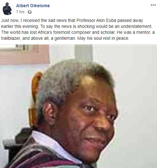Professor Akin Euba, a prolific Nigerian composer, musicologist, pianist, and author, has died less than two weeks to his 85th birthday.