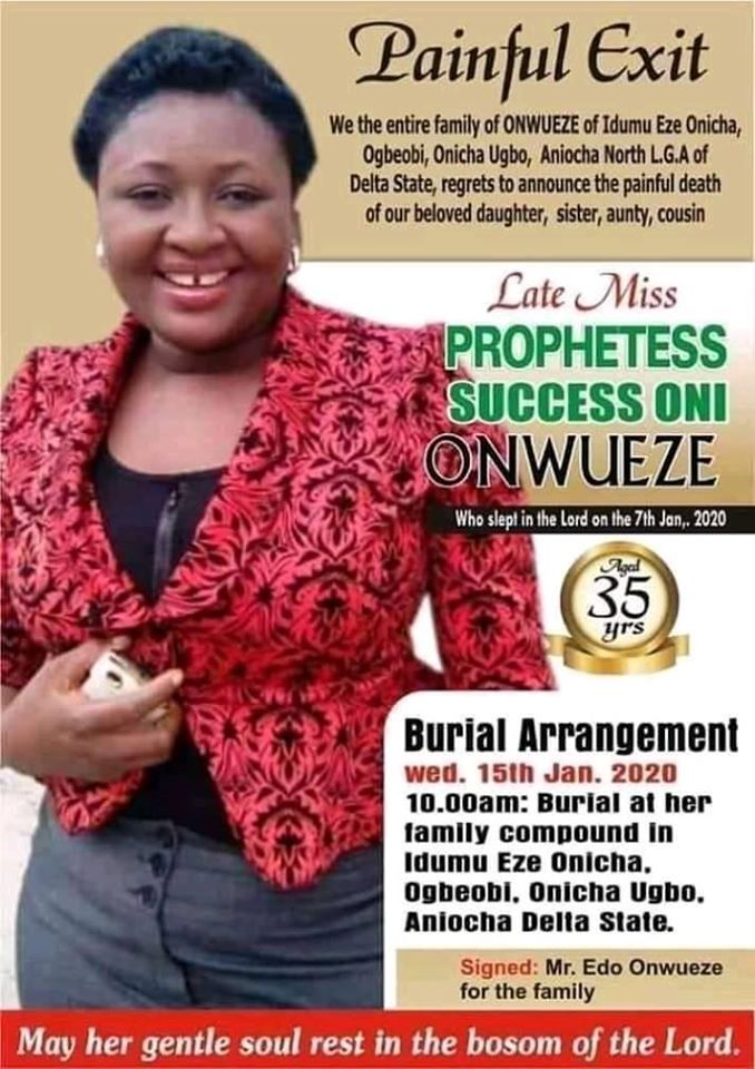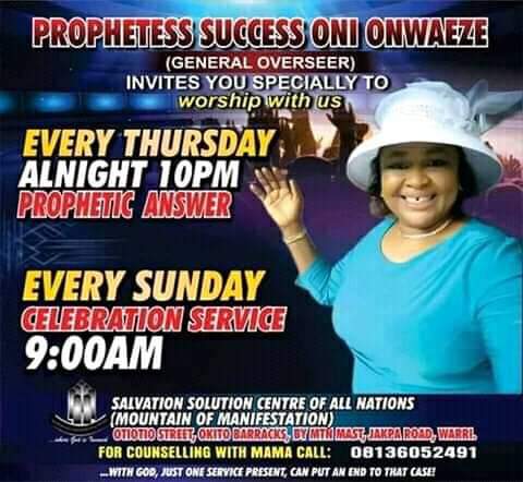 See the Obituary of Prophetess Success Oni Onwaeze below.