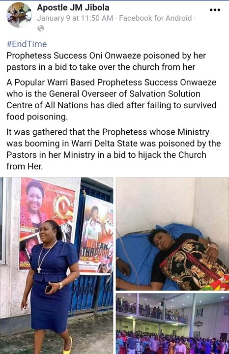 A 35-year-old Warri based Prophetess, Success Oni Onwueze has allegedly been poisoned to death by her Junior pastors in order to take over her church, Salvation Solution Centre of All Nations.