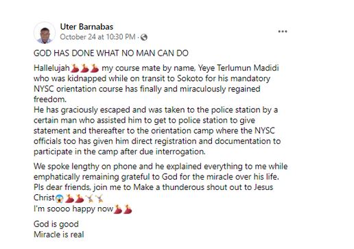 A graduate of Benue State University (BSU), Yeye Terlumun Madidi, who was abducted on his way to the NYSC orientation camp has escaped the kidnapper’s den.