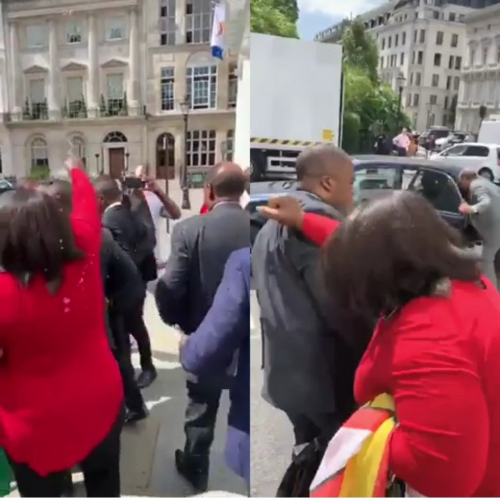 A video shared on Twitter by Hopewell Chin’ono, @daddyhope, wrote: “I am saddened by these visuals from London where the Foreign Minister S.B. Moyo & the Information Permanent Secretary Nick Mangwana were attacked by angry Zimbabweans.