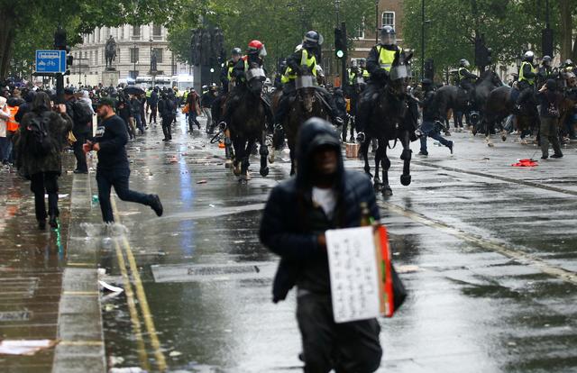 After a largely peaceful protest in London, a few demonstrators near British Prime Minister Boris Johnson’s residence threw bottles at police, and mounted officers charged push protesters back.