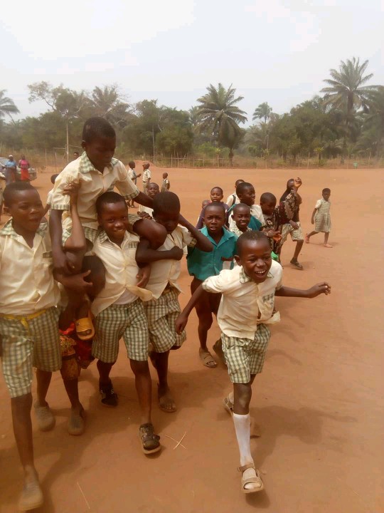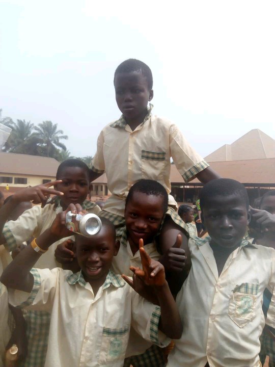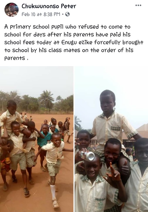 The Facebook user wrote : A primary school pupil who refused to come to school four days after his parents have paid his school fees today at Enugu ezike forcefully brought to school by his class mates on the order of his parents.