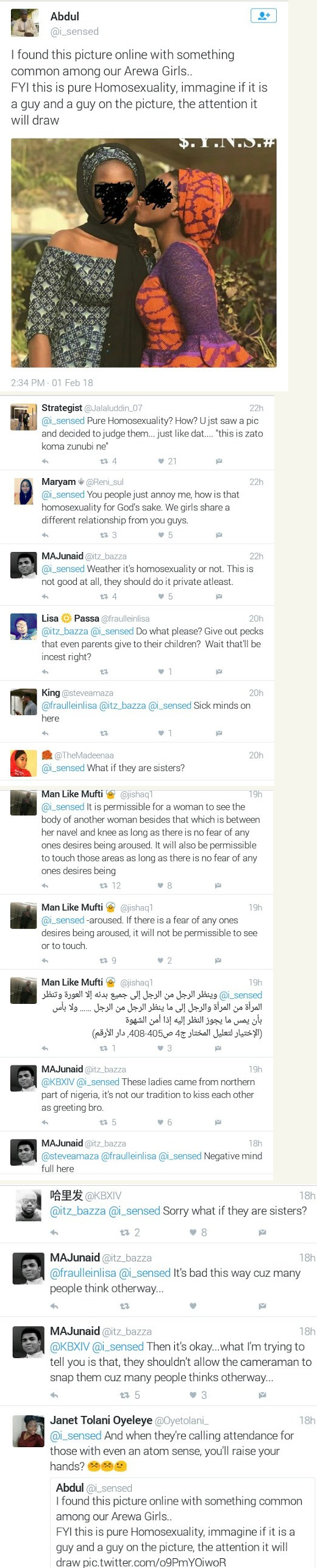 He tweeted; I found this picture online with something common among our Arewa Girls.. FYI this is pure Homosexuality, imagine if it is a guy and a guy on the picture, the attention it will draw
