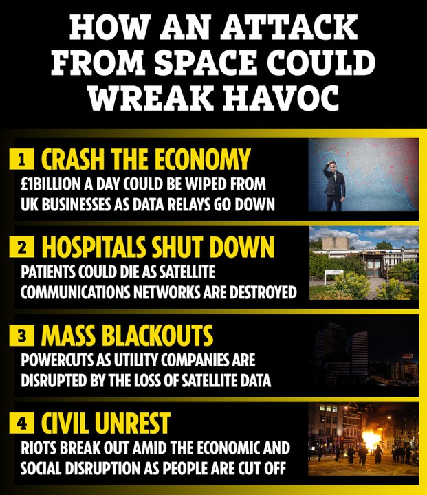 It is feared an orbital onslaught could shut down hospitals, crash the economy, knock out communications, and cause mass blackouts.