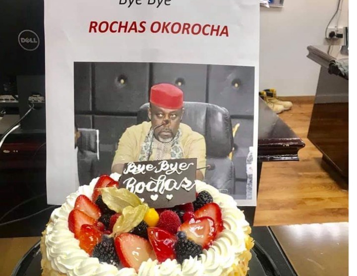 Qatar Based Nigerian Celebrates Rochas Okorocha’s Departure With A Cake In His Office