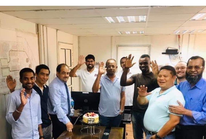Mr Prince Uwa an impolite base in Doha, Qatar celebrates with his colleagues in the office over the bowing out of Governor Rochas Okorocha
