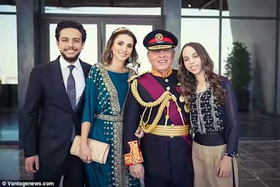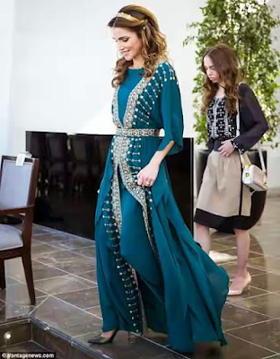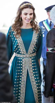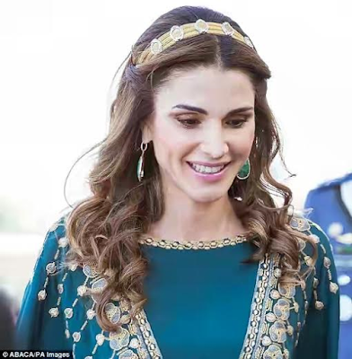 The 45-year-old mother of four was in attendance with her husband King Abdullah as the country celebrated the centennial of The Great Arab Revolt. She looked radiant in a floor-length emerald dress with elaborate gold embellishments. For accessories, she went for a simple gold band studded with medallions over her loosely styled hair, a gleaming gold Dior clutch bag and a pair of green pear-shaped drop earrings. Also in attendance were her children, Prince Hussein, 21 and Princess Salma, 15.