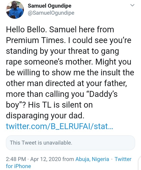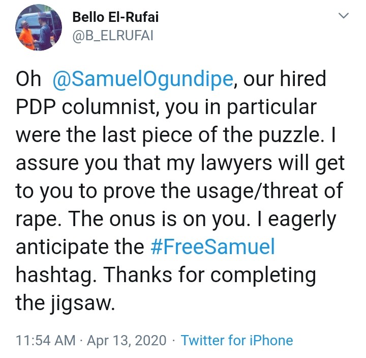 “Oh @SamuelOgundipe, our hired PDP columnist, you in particular were the last piece of the puzzle. I assure you that my lawyers will get to you to prove the usage/threat of rape. The onus is on you. I eagerly anticipate the #FreeSamuel hashtag. Thanks for completing the jigsaw.,” he said in a tweet.