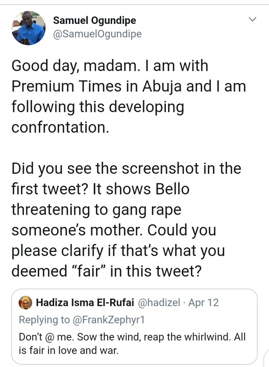 The young El-rufai had at the weekend threatened to gang rape the mother of his rival on the micro-blogging site. TODAY POLITICS alongside other new medium reported the argument between the duo.