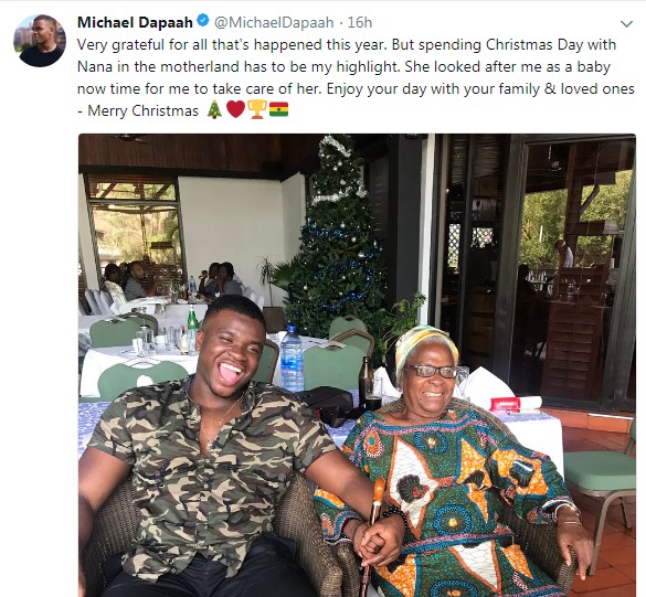 ‘very grateful for all that’s happened this year. But spending Christmas Day with Nana in the motherland has to be my highlight. She looked after me as a baby now time for me to take care of her. Enjoy your day with your family & loved ones’.