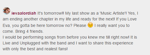 Recently engaged Nigerian rapper, Eva has announced her retirement from music/being called a music artiste! She shared this on her IG today: