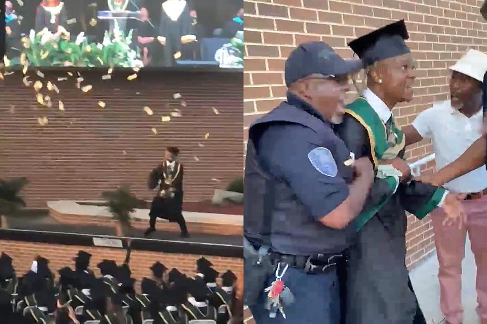 Police handcuffed the 18-year-old and escorted him out of the commencement ceremony. He was detained for attempting to ‘start a riot and disorderly conduct’, and ticketed for the offense.