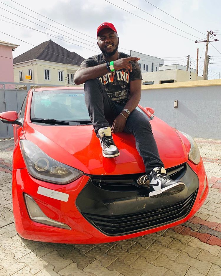 Sharing a photo of his manager sitting on a red brand new Hyundai that he got for him as a birthday gift, the rapper wrote;