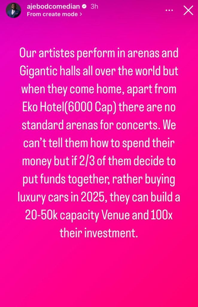 Comedian Emeke Erem aka Ajebo, says rather than splurging huge sums of money purchasing luxury cars in 2025, Nigerian artists should come together and build 20-50k capacity gigantic halls that will give them 100 times their investment.