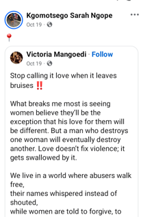 On the same day, she shared a post by one Victoria Mangoedi, titled: “Stop calling it love when it leaves bruises.”