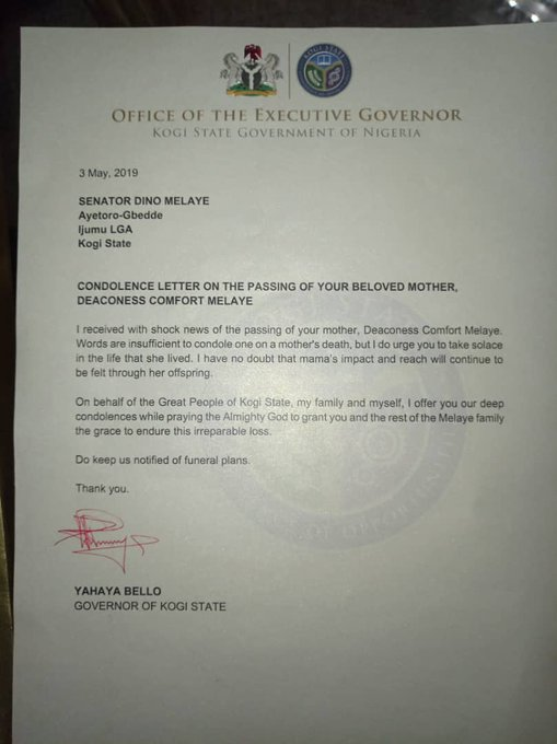 Read Governor Yahaya Bello's Condolence Letter To Senator Dino Melaye - 9jaflaver