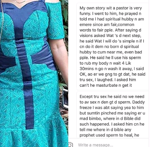 Read lady’s story of how pastor wanted to rub his sperm on her to chase away spiritual husband
