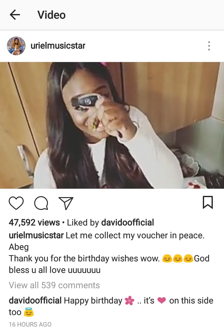 So yesterday was uriel’s birthday and she was excited when a fake davido instagram account wished her a happy birthday thinking it was the real davido.