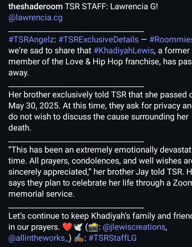 According to popular entertainment and celebrity news website, The Shade Room, Khadiyah Lewis passed away on May 25, 2025.