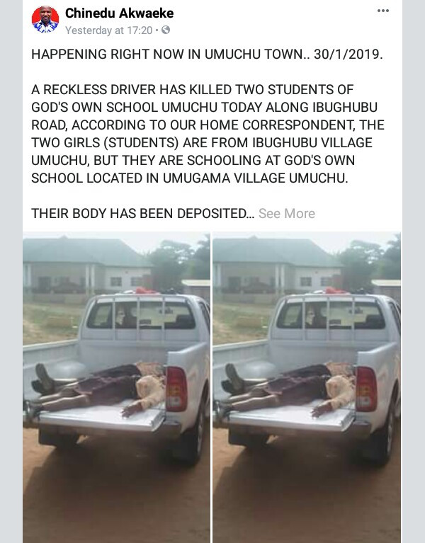 A driver reckless driver rammed into a group of students in Umuchu, Anambra State, killing two on the spot.