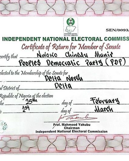 He captioned his photo, “TODAY I RECEIVED MY CERTIFICATE OF RETURN FROM INEC AT THE INTERNATIONAL CONFERENCE CENTER ABUJA”.