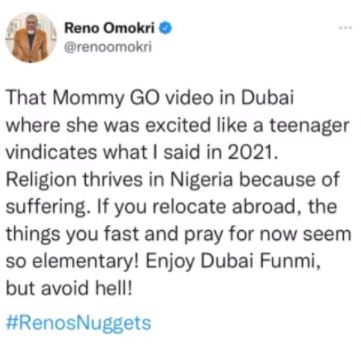 Omokri stated that the video vindicates what he said in 2021, about religion thriving in Nigeria because of suffering. He added that when people relocate abroad, the things they fast and pray for in Nigeria seem so elementary.