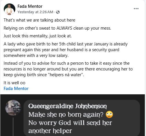 “That’s what we are talking about here. Relying on others’ sweat to ALWAYS clean up your mess. Just at look this mentality, just look at. A lady who gave birth to her 5th child last year January is already pregnant again this year and her husband is a security guard somewhere with a very low salary,” he wrote.