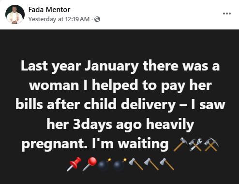 “Last year January there was a woman I helped to pay her bills after child delivery – I saw her 3 days ago heavily pregnant. I’m waiting,” he wrote in a Facebook post on Tuesday.