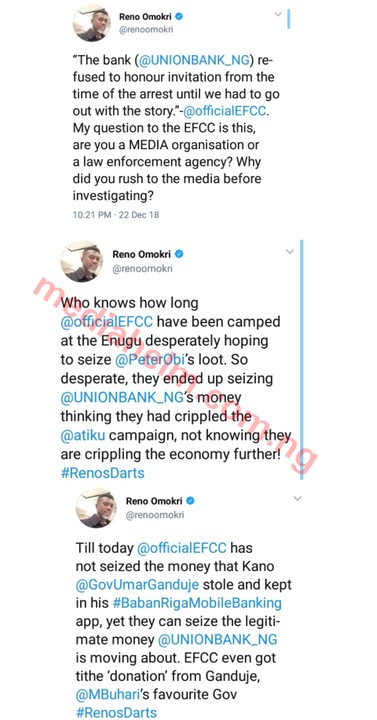 The former aide and PDP ranting machine, Reno Omokri talked about how EFCC kept Legitimate money of UnionBank which they sized at Enugu airport claiming it is Money laundering. After many prove by the bank they still insist , because they thought it’s for funding of Atiku campaign.