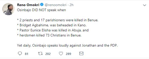 Nigerians has reacted on Reno Omokiri’s tweet which condem VP Osinbajo’s silence on issues surrounding the killings by Herdsmen in Benue and Boko Haram in the North East.