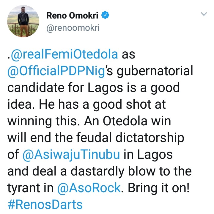 @realFemiOtedola as @OfficialPDPNig’s gubernatorial candidate for Lagos is a good idea. He has a good shot at winning this. An Otedola win will end the feudal dictatorship of @AsiwajuTinubu in Lagos and deal a dastardly blow to the tyrant in @AsoRock. Bring it on! #RenosDarts