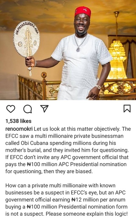 Let us look at this matter objectively. The EFCC saw a multi millionaire private businessman called Obi Cubana spending millions during his mother’s burial, and they invited him for questioning. If EFCC don’t invite any APC government official that pays the ₦100 million APC Presidential nomination for questioning, then they are biased.