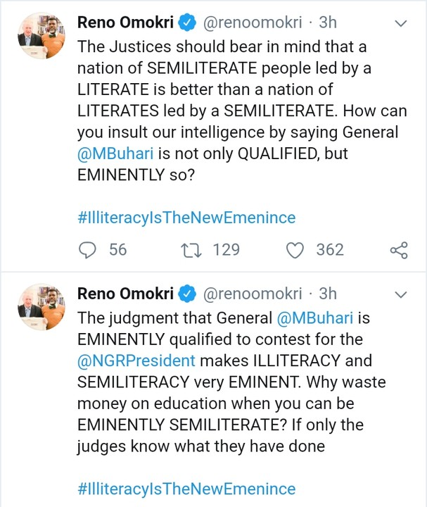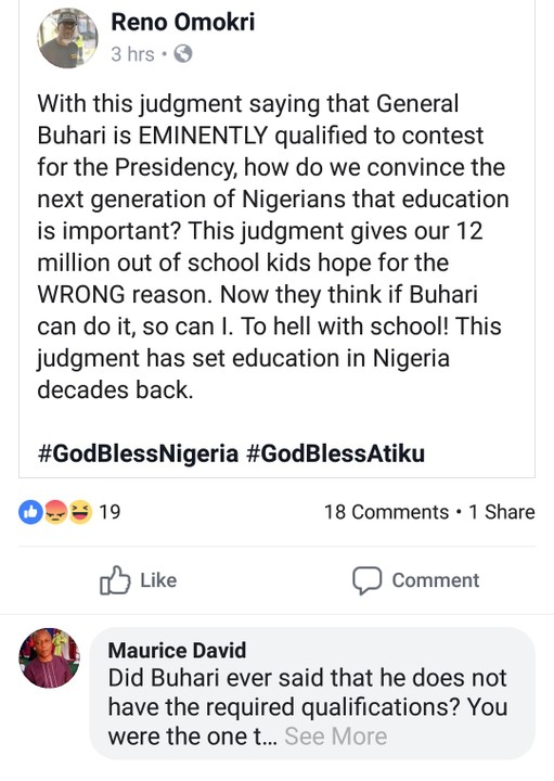With this judgment saying that General Buhari is EMINENTLY qualified to contest for the Presidency, how do we convince the next generation of Nigerians that education is important? This judgment gives our 12 million out of school kids hope for the WRONG reason.