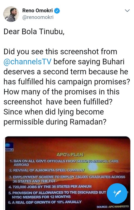 Dear Bola Tinubu, How could you say Buhari deserves a Second Term because he has kept his campaign promises? Why do Buhari, Lai Mohammed, @Garshehu and now Tinubu continue lying during Ramadan? Is ₦1 equal to $1? Is petrol ₦40 per liter? Has he created 3 million jobs per year?