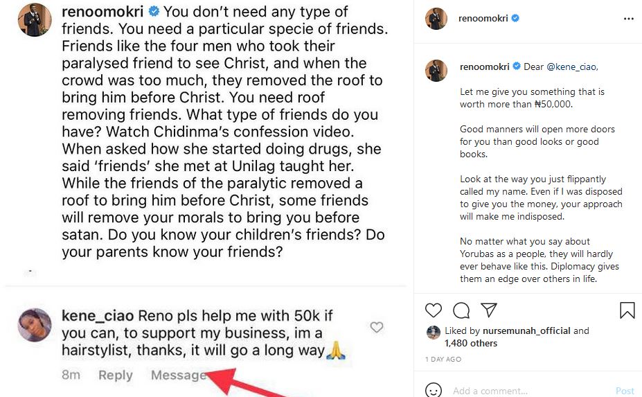 Former aide to Goodluck Jonathan and author, Reno Omokri has called out a woman who came to his Instagram page to request financial aid.