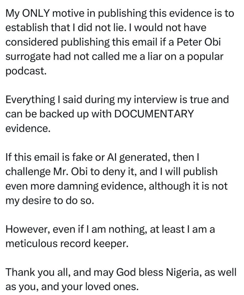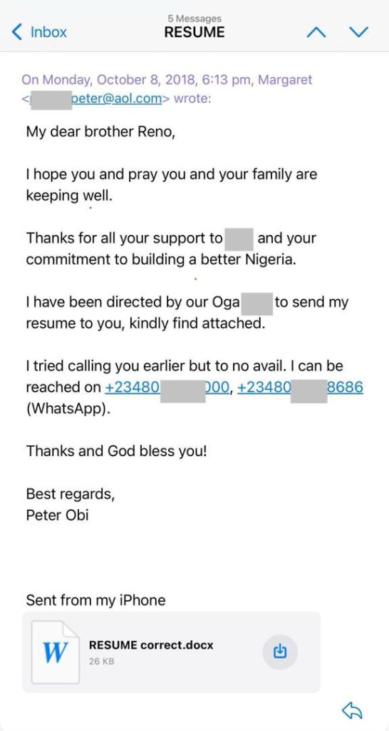This Peter Obi that you see was calling ‘Reno have you gotten the CV. Ehn Check now! Refresh! This Peter Obi! He can not deny it. The emails are there. If he will deny it, I will disgrace him. He was sending me his CV unsolicited’’.