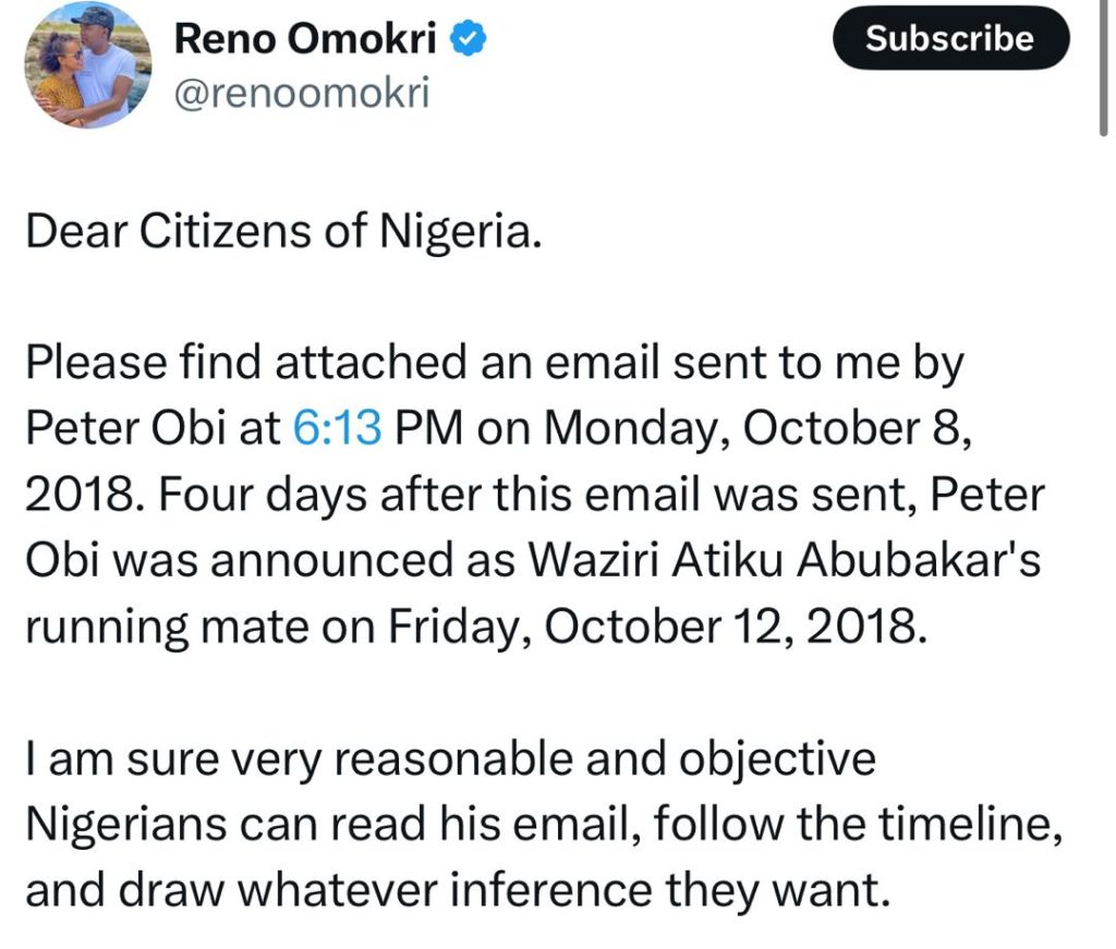 Reno Omokri shares purported email Peter Obi sent to him containing his CV so he could be considered as Atiku Abubakar’s running mate in 2019