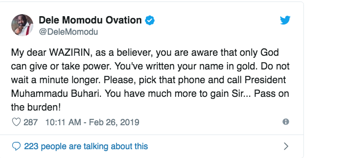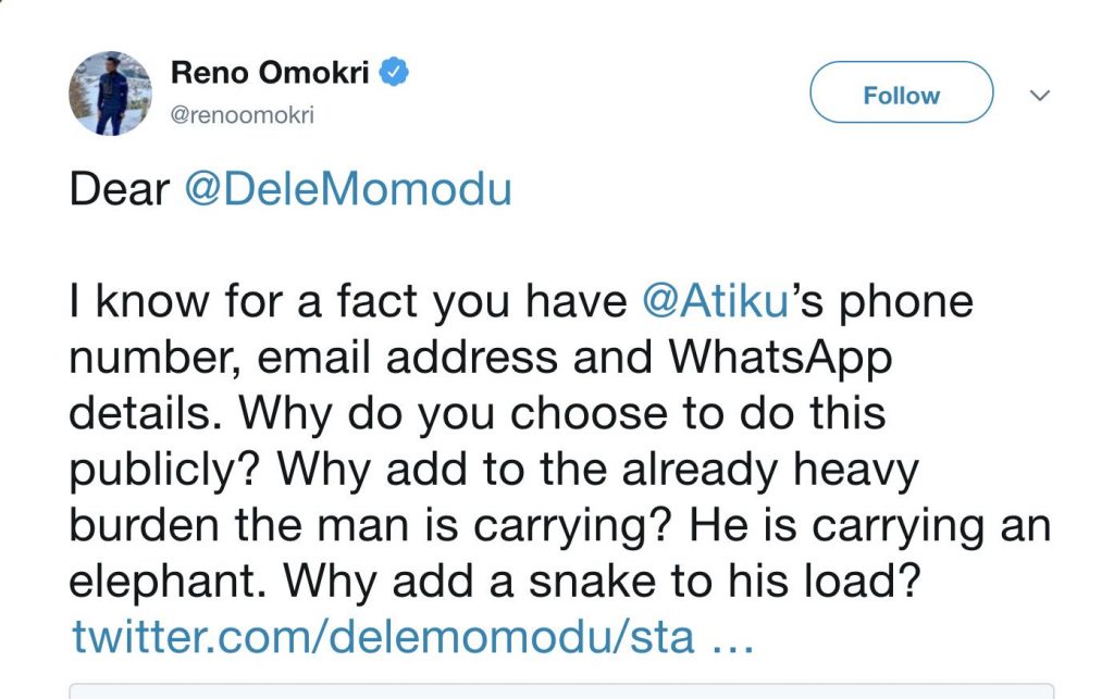 The former presidential aide, Reno Omokri, has attacked Dele Momodu for calling on People’s Democratic Party (PDP) presidential candidate, Atiku Abubakar to accept defeat and congratulate President Buhari over the phone.