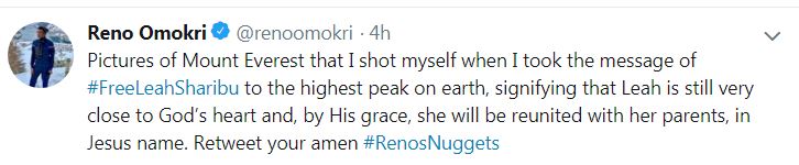 Reno Omokri who has been really focused on the Free Leah Sharibu campaign has taken the campaign to the highest peak on earth…
